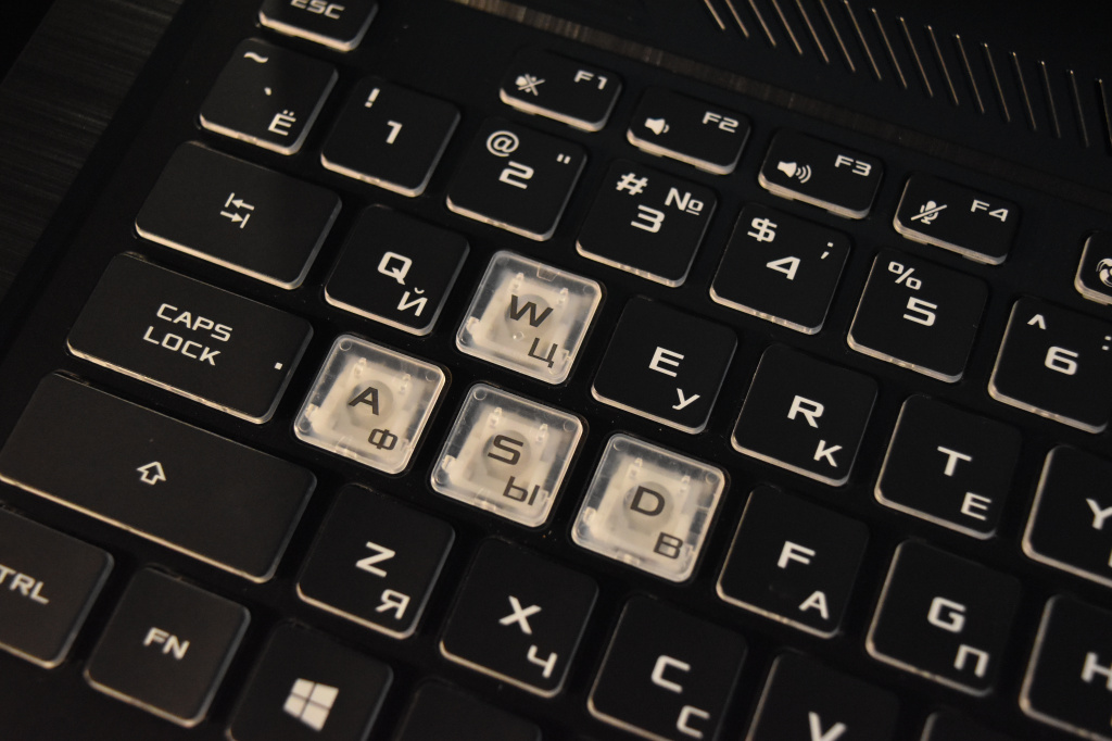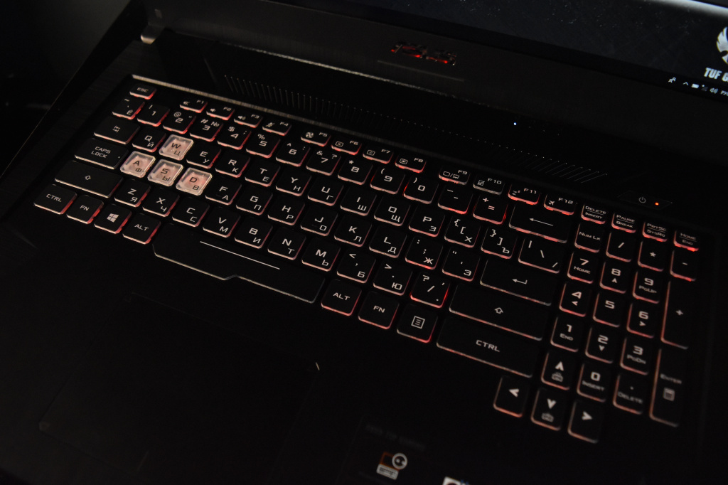 Среди устройств ввода лэптопа есть стандартный тачпад с имитацией нажатий на кнопки, а также мембранная клавиатура с трехуровневой RGB-подсветкой под стать всем трендовым игровым клавиатурам современности. Встроенная в данную модель ноутбука клавиатура имеет ход 1.8 мм, а клавиши WASD отличаются по материалу кейкапов от остальных. По всей видимости, ASUS TUF FX705GM-EW228T ориентирован для поклонников шутеров. Ресурс нажатий клавиш составляет 20 миллионов, ну а RGB-подсветка настраивается с помощью фирменного софта TUF Aura Core.