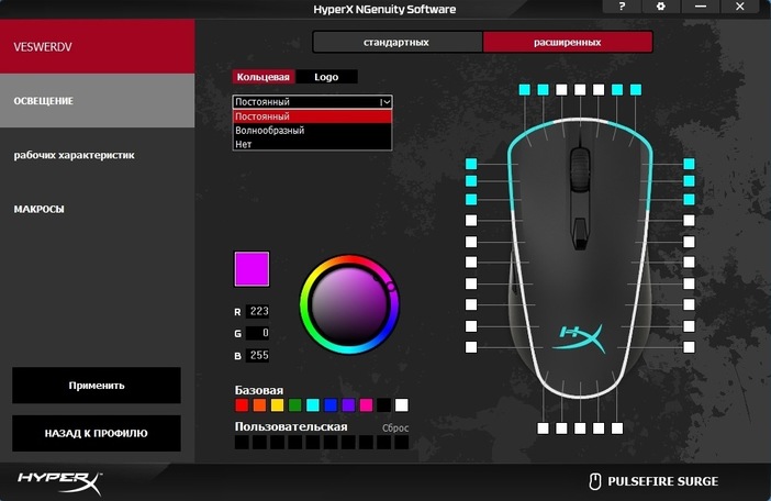 Что касается программного обеспечения, то Pulsefire Surge – это первая мышь в линейке, которая получила поддержку фирменного софта HyperX под названием «NGenuity Software». Программа интуитивно понятная и предоставляет геймеру полный комплект инструментов для персонализации настроек и параметров мышки. Помимо привычной настройки чувствительности от 100 до 16 000 dpi с шагом в 50 dpi, а также настройки профилей, записи макросов и переназначения клавиш, NGenuity Software преподносит некоторые сюрпризы. Например, при персонализации RGB-подсветки можно полностью настроить цвет, яркость и эффект свечения каждого из 32 светодиодов. Такого мы еще не видели ни в одной мышке.